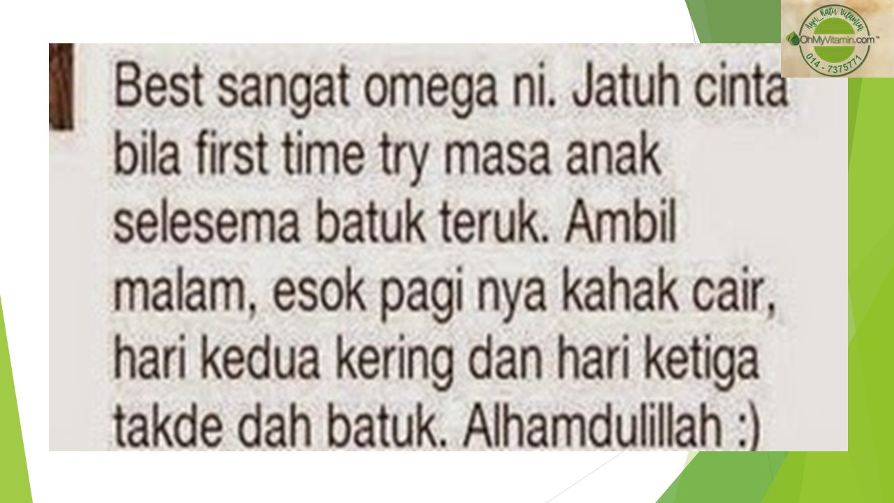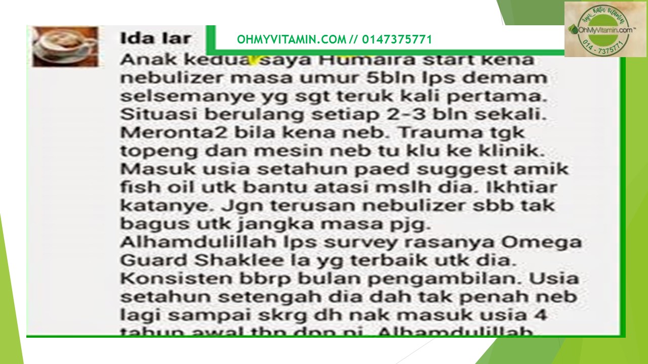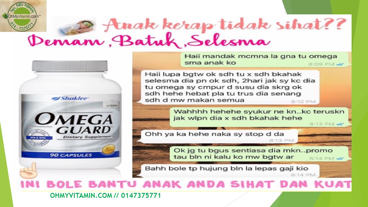 - 10) berikan bayi makanan tambahan yang mengandungi omega 3.minyak ikan terbaik, omega guard shaklee. Boleh wasup www.wasap.my/60147375771/omegaguard