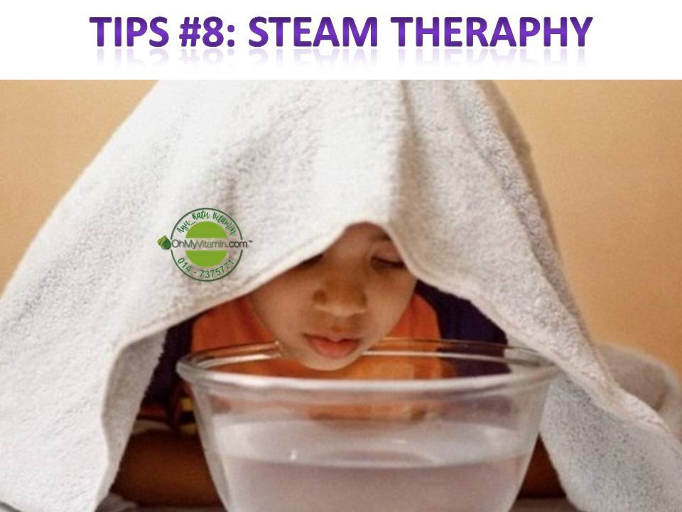 - 8)Thermal steam theraphy. Dudukkan dekat air humidifier beberapa minit atau letak muka over mangkuk panas. Pastikan suhu air sesuai utk anak.