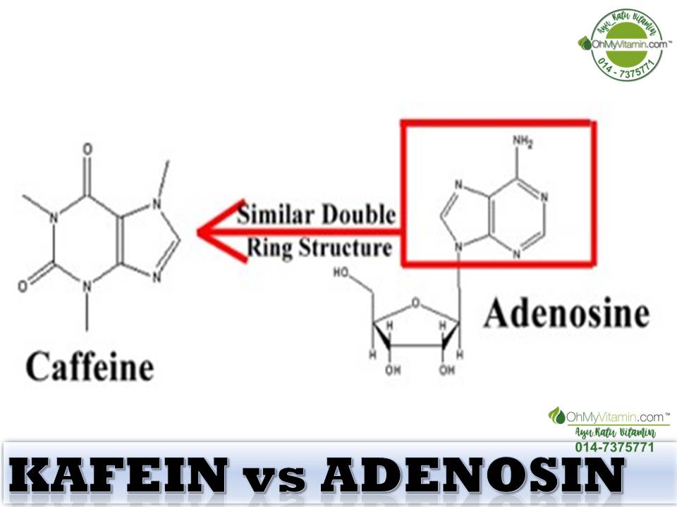 Badan kita mengenali kafein seakan adenosine.Ini adalah kerana struktur yang hampir sama. Tapi, kafein ni bertindak bertentangan dengan adenosine. Hasilnya, badan kita menjadi lebih aktif apabila fungsi adenosine telah diambil alih oleh kafein. Otak pula memproses maklumat sebagai sesuatu yang bahaya berlaku dalam badan, dan terhasilnya adrenalin (hormone) yang bekerja dalam mekanisma “fight or flight”. Jadi, kafein ni juga menjadi punca untuk menghilangkan mengantuk dan letih.
