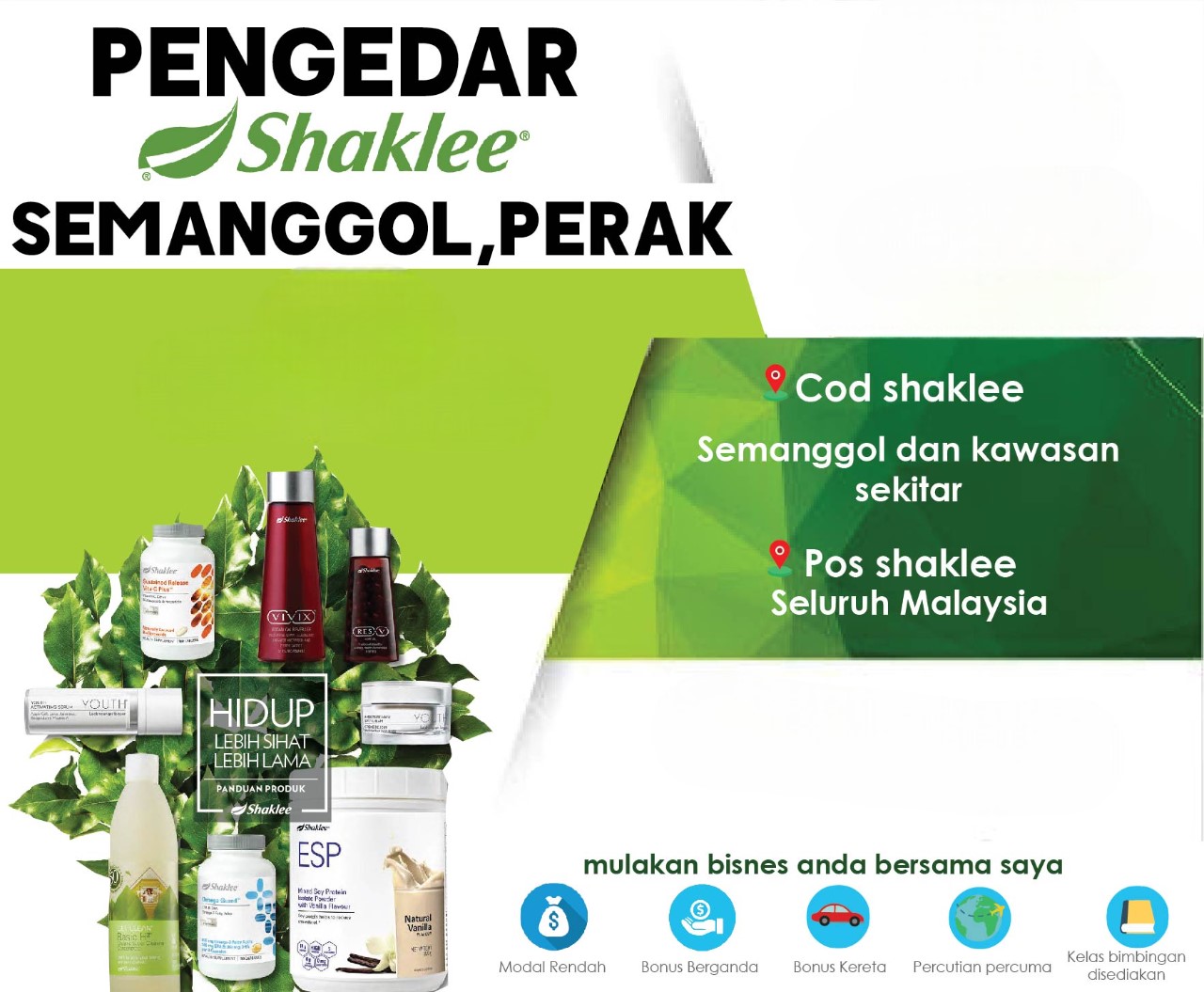 • Dengan keahlian Shaklee, anda boleh membina perniagaan sendiri tanpa perlu modal yang besar. Anda hanya perlu berkongsi manfaat produk kepada orang lain, dan Shaklee akan menguruskan penghantaran produk terus kepada pelanggan anda.
