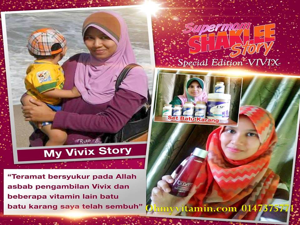 Kemudian saya mula membeli tambahan vitamin sebab saya nk kesan yang extra. Saya nak hilangkan terus batu karang. Saya mula minum Vivix. Alhamdulilah. Bersyukur sgt asbab sebotol Vivix yang saya minum, hasil pemeriksaan doktor batu karang saya hilang! Doktor pun terkejut dan tanya apa yang saya amalkan. Saya bawa botol Vivix dan tunjuk pada doktor. Doktor nasihatkan saya untuk terus amalkan pengambilan nutrisi yg sihat untuk mencegah batu karang dari terbentuk kembali. Saya mula beli Vivix selepas daftar sebagai ahli Shaklee.