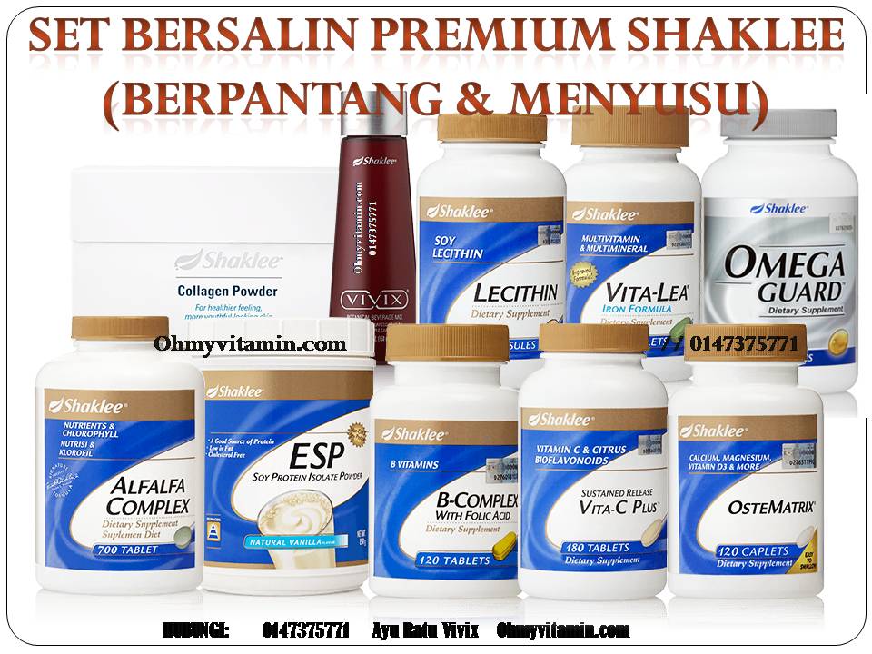 Haa, nampak tak. Set bersalin dalam gambar atas ni adalah set bersalin premium. 2 in 1, untuk milk booster sekali. Selain badan sihat, dapat juga tingkatkan pengeluaran susu yang banyak tau. Di sini, saya akan huraikan serba ringkas, satu persatu fungsi vitamin yang ada dalam set bersalin shaklee ni..